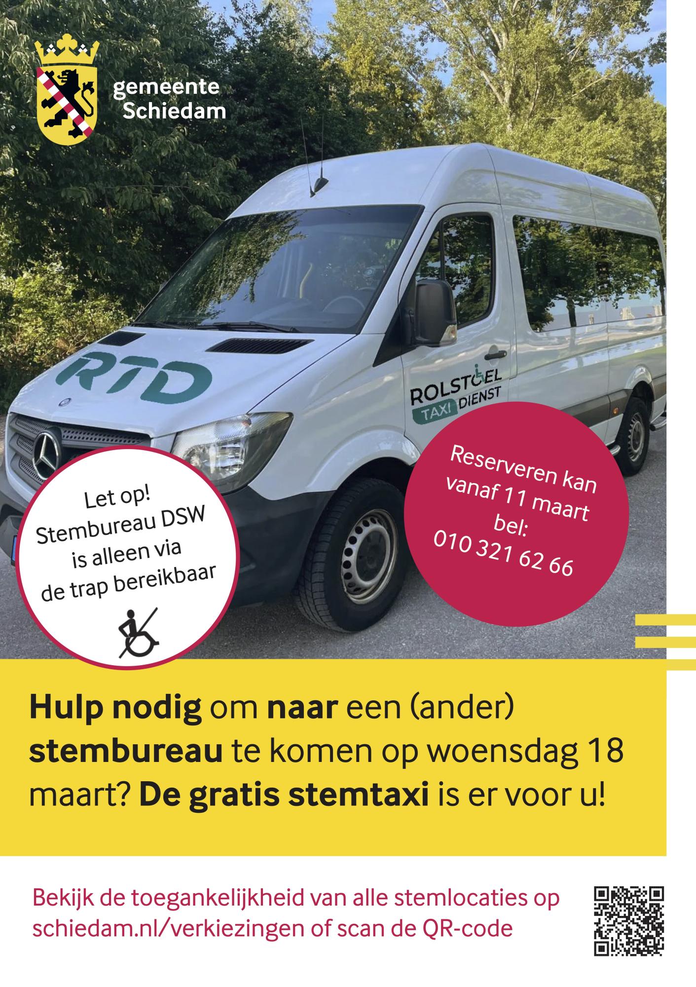 Reserveer de stemtaxi vanaf 11 maart via telefoonnummer 010–3216266 en geef aan dat je de gratis stemtaxi Schiedam nodig hebt.