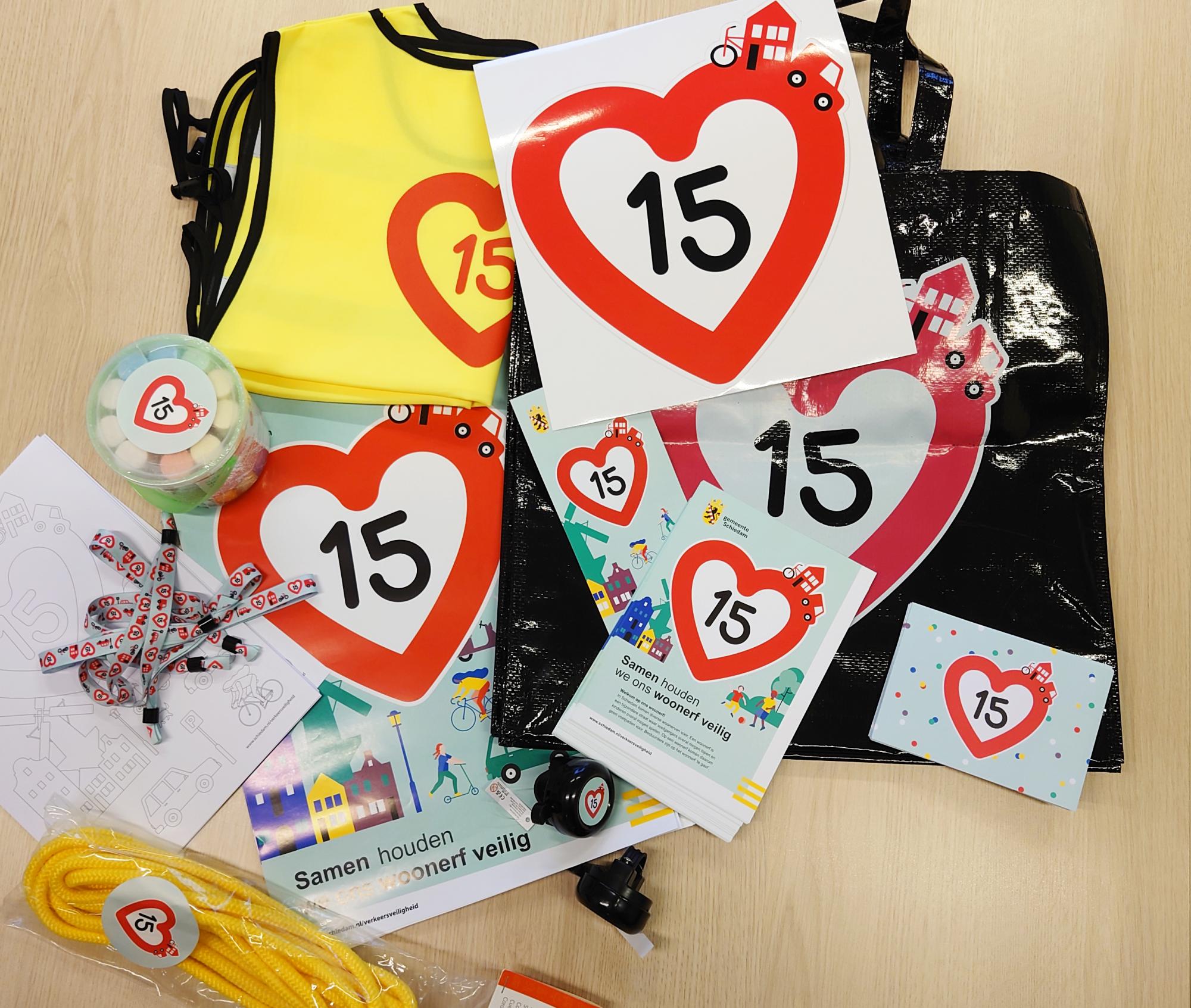 De box bevat allerlei middelen om aandacht te vragen voor de verkeersveiligheid op woonerven, zoals flyers, posters, kliko-stickers, bedrukte hesjes, stoepkrijt en fietsbellen.