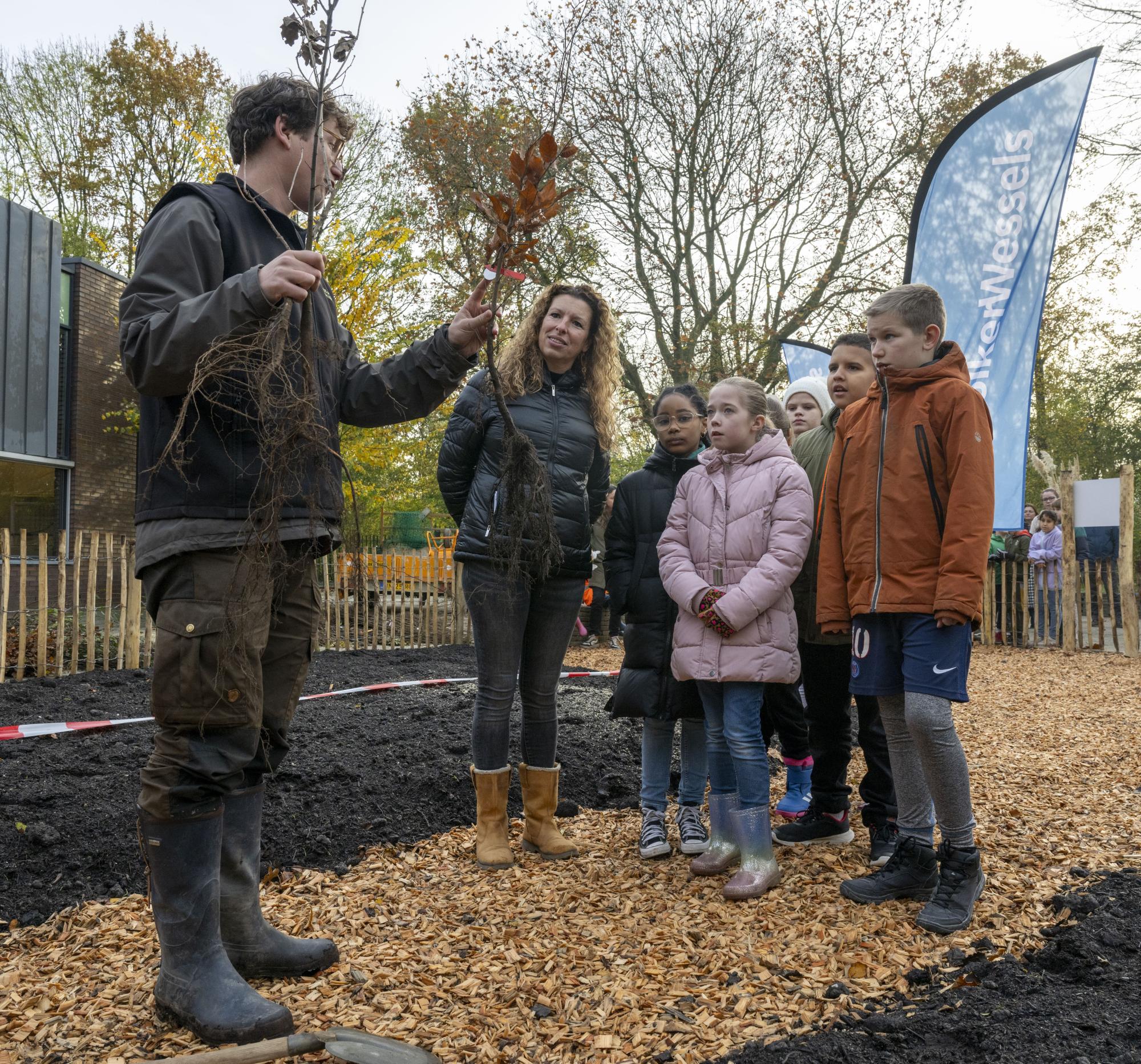 De afgelopen weken heeft VolkerWessels-onderneming Gebr. Van Kessel al voorbereiding getroffen op het schoolplein, zodat de kinderen vandaag direct aan de slag konden met het planten van de boompjes. "Met elkaar zijn we overtuigd dat extra natuur bij schoolpleinen veel kan betekenen voor klimaatadaptatie en het zorgt ervoor dat kinderen veilig en zorgeloos kunnen spelen in een groene omgeving. Door dit schoolplein van maar liefst 1200 m2 te vergroenen en een insectenhotel is er aandacht voor de biodiversiteit. Naast een gezond leefomgeving voor de dieren en planten is er aandacht voor een gezonde omgeving en meer beweging voor kinderen. Corné op 't Hof gaat als beweegcoach en JOGG-regisseur van Schiedam samen met de buurt, zoals de vrienden van Beatrixpark en de kinderopvang Mundo aan de slag met een nieuw beleefpad voor de allerkleinste in het Beatrixpark.