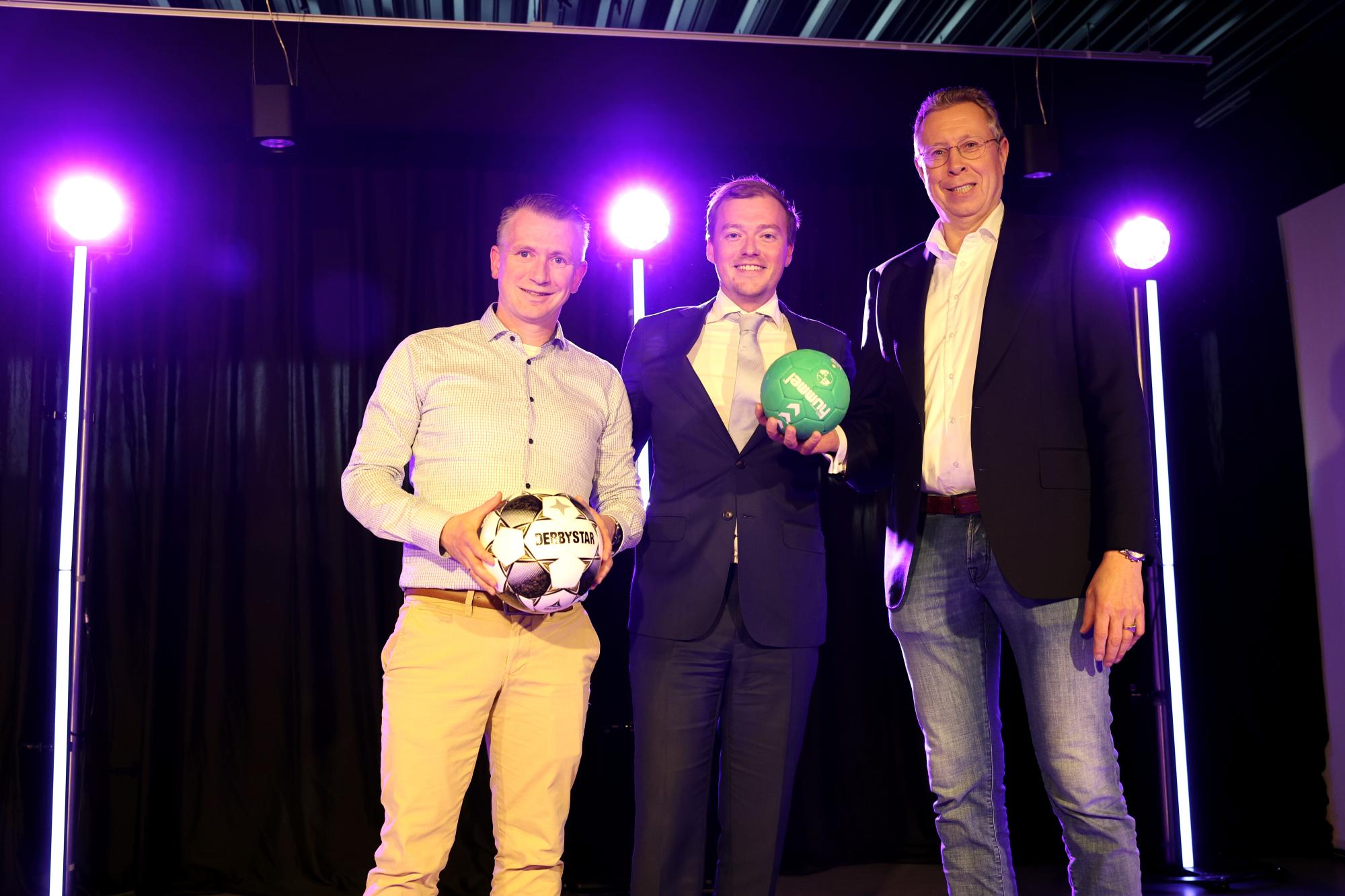 Wethouder Volkman (Sport) heropende het sportpark met de overhandiging van een bal aan Niels Verduijn, secretaris van voetbalvereniging Kethel Spaland (l) en Robert Sebrechts, vice voorzitter van handbalvereniging Ventura.