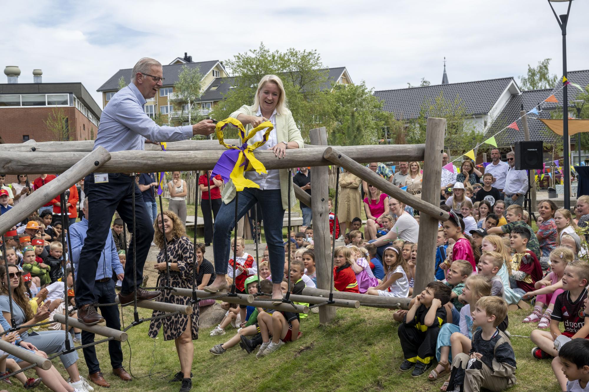 Vanmiddag werd het gemeenschappelijke en groenblauwe schoolplein van de basisscholen De Vlinder en De Violier officieel geopend. Demissionair wethouder Patricia van Aaken en afkoppeladviseur Alfred van 't Hoff knipten het gele lint door terwijl ze wiebelend op een houten speeltoestel stonden.