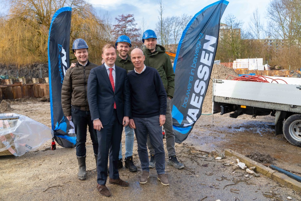 Medewerkers van Vaessen, wethouder Youri Volkman en Sicco Stienstra, directeur van Sportbedrijf Schiedam, op de bouwplaats.